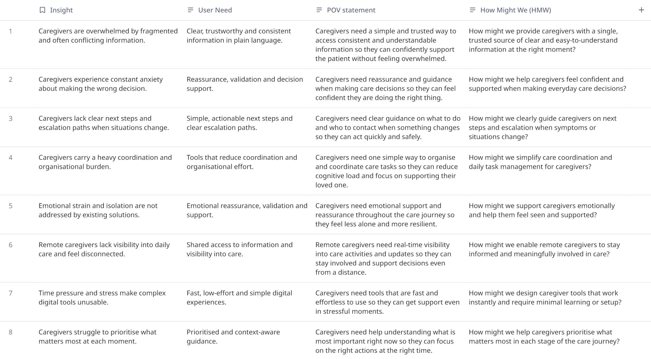 This synthesis allowed us to move from raw qualitative data to a shared, evidence-based understanding of the caregiver experience, resulting in a set of core experience themes that highlighted the most critical unmet needs and systemic gaps. These themes became the foundation for defining opportunity areas, shaping problem statements and prioritising the concepts that were later taken forward for end-to-end design and user validation.
