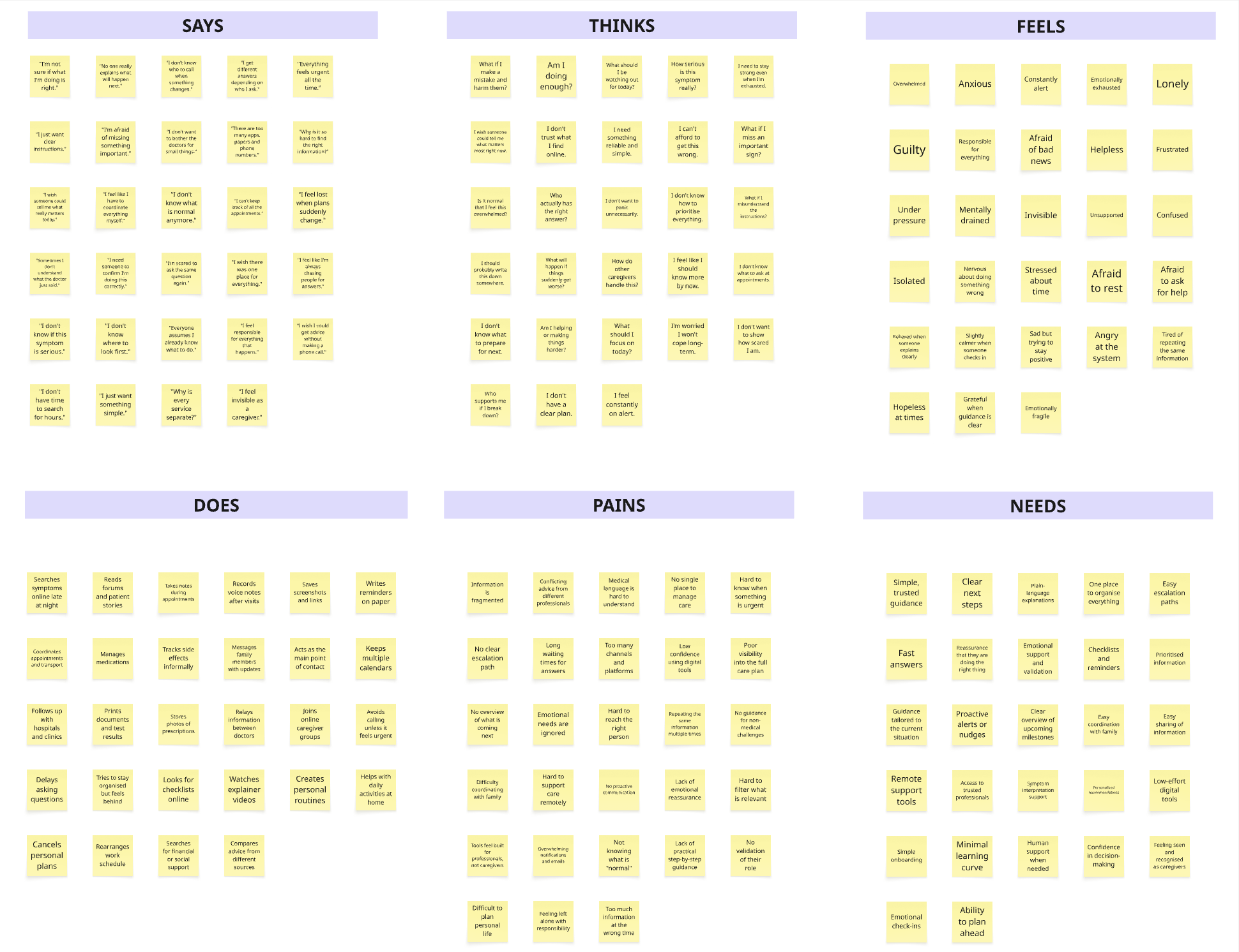 After completing the empathy mapping, I led a structured theming exercise to cluster all caregiver observations, quotes and behaviours into clear insight groups. By affinity-mapping the post-its across emotional, cognitive and behavioural dimensions, we identified recurring patterns and validated them across different caregiver profiles.