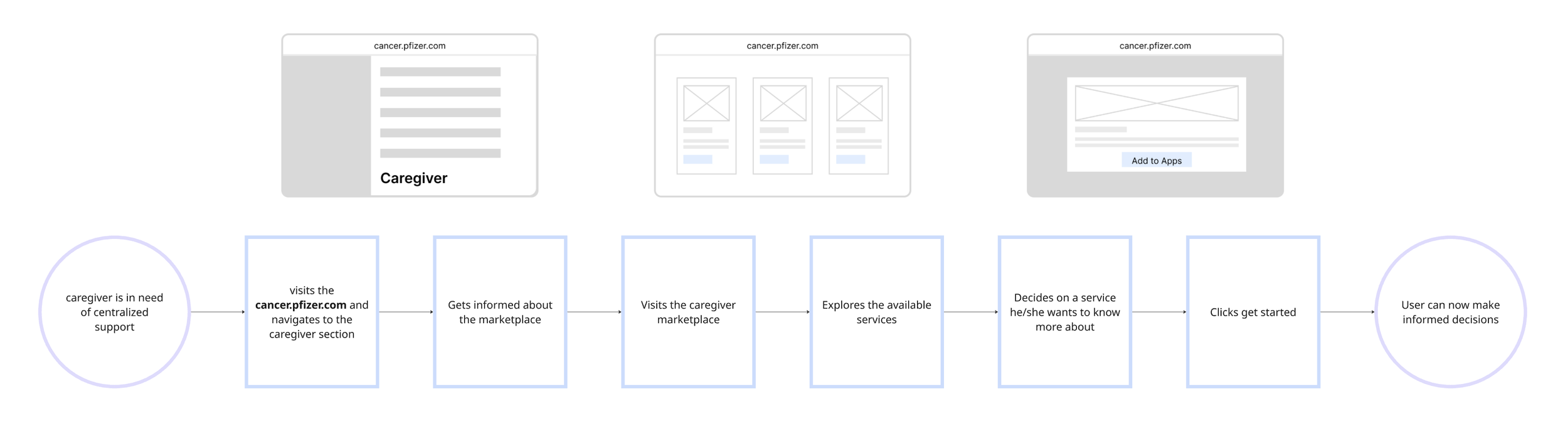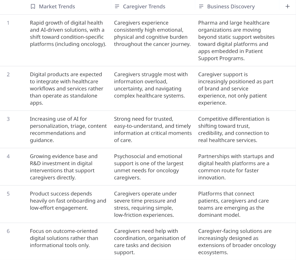 I started with market research to understand the oncology caregiver landscape, user needs, and healthcare innovation trends, in order to build a holistic view of the caregiver market and the broader healthcare ecosystem in which Pfizer operates.