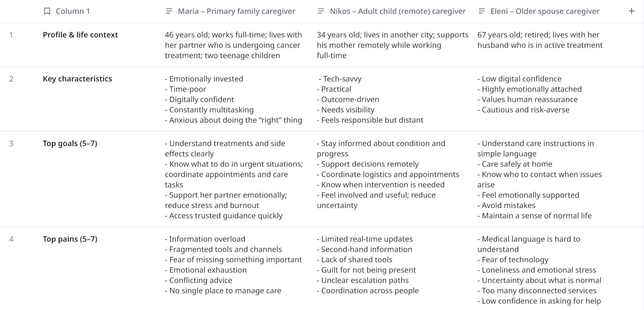 To validate the provisional oncology caregiver personas and deepen our understanding of real caregiver needs, I conducted qualitative user interviews with caregivers supporting patients through different stages of the oncology journey at Pfizer.