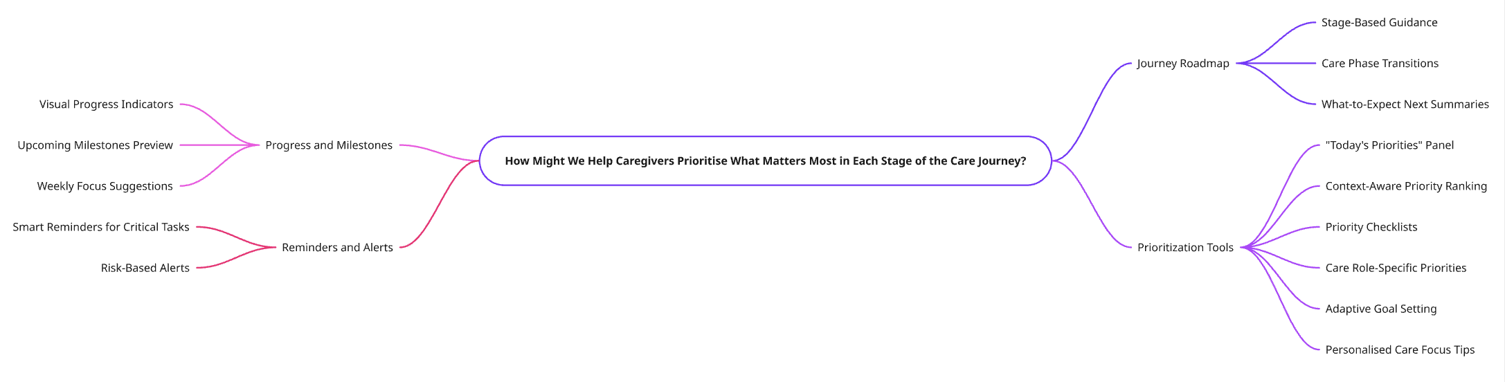 After synthesising the research insights and caregiver needs, I created Point-of-View (POV) statements to clearly define the problems from the caregiver’s perspective. These POVs were then translated into How Might We questions, which framed the most meaningful challenges and guided the team’s ideation and concept development.
