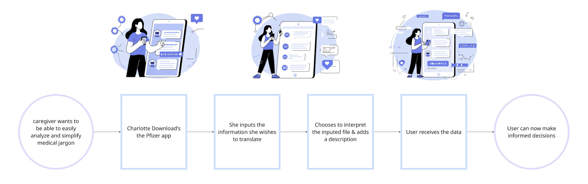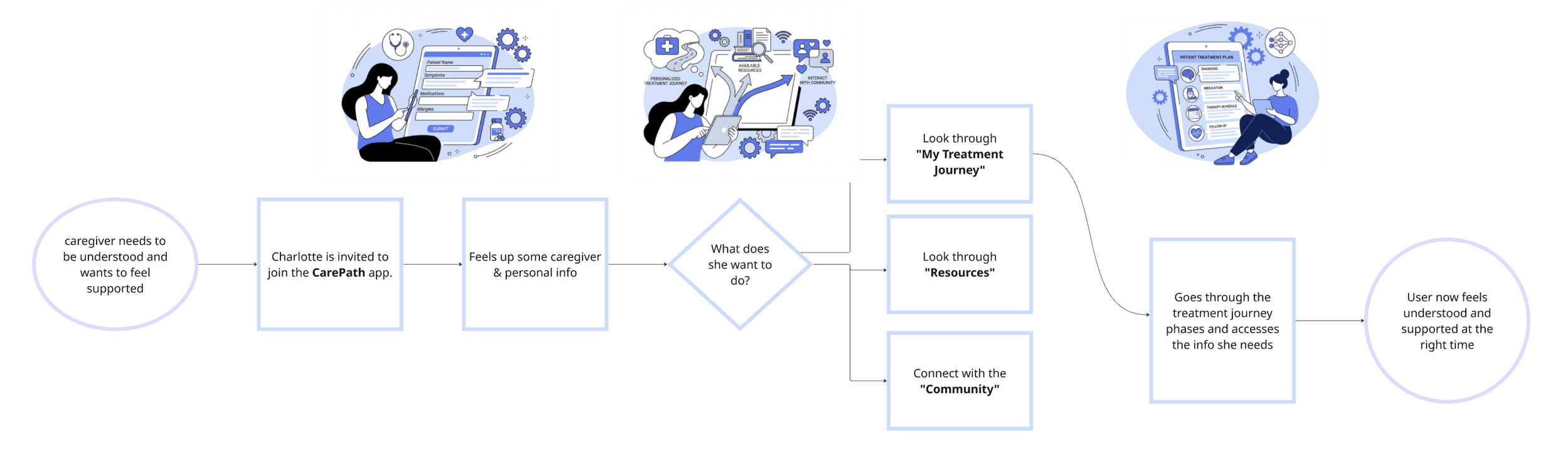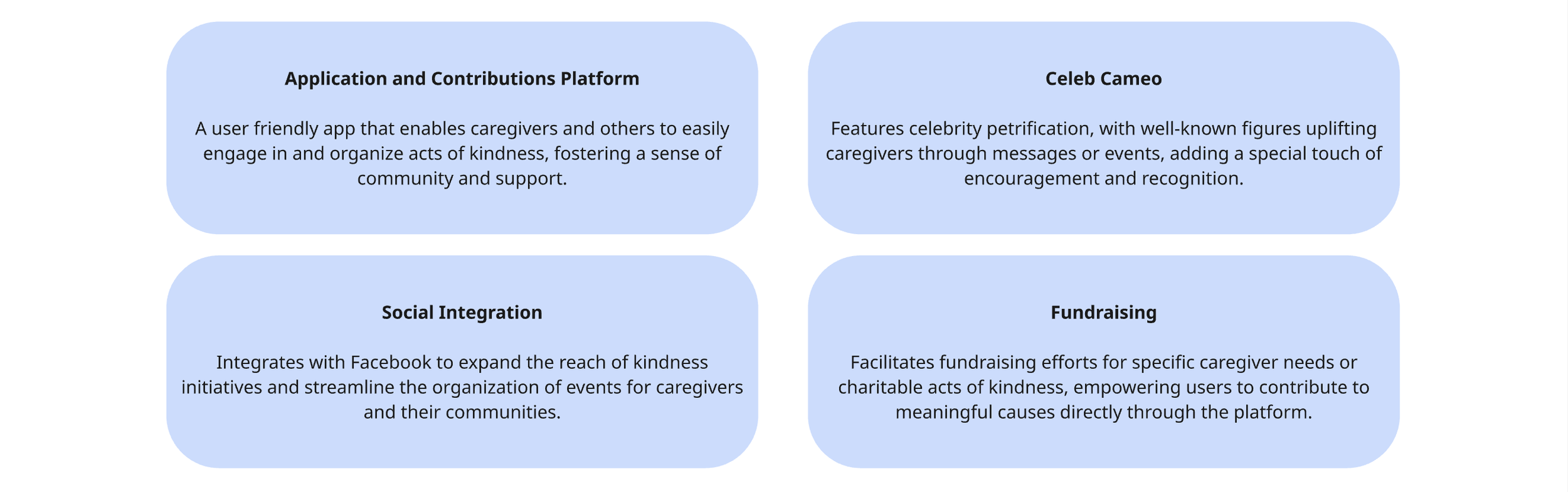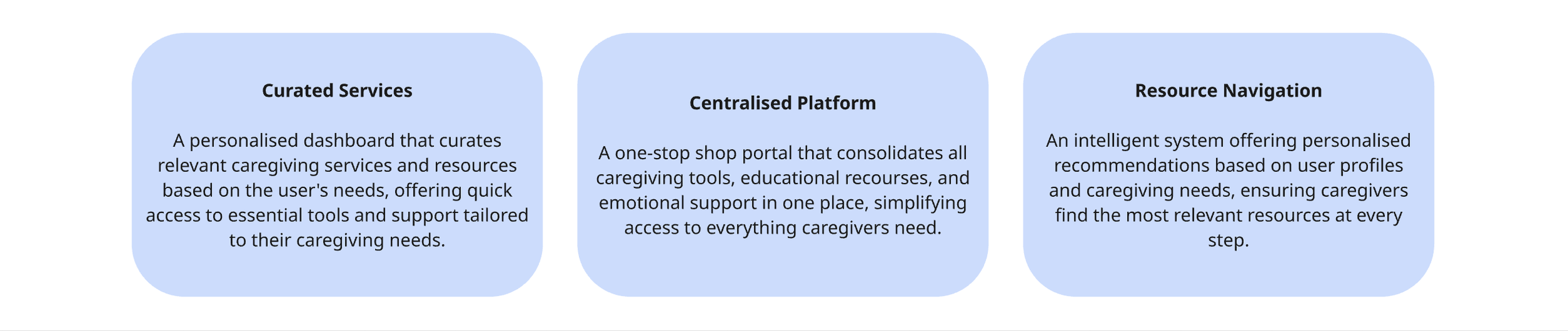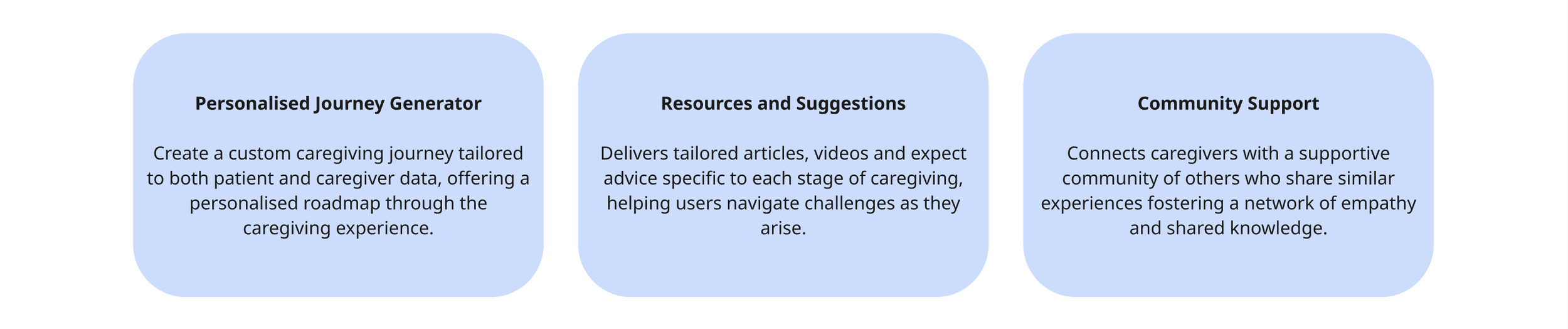 Each concept addresses key pain points experiences by caregivers, such as emotional support, medical navigation and resource coordination.