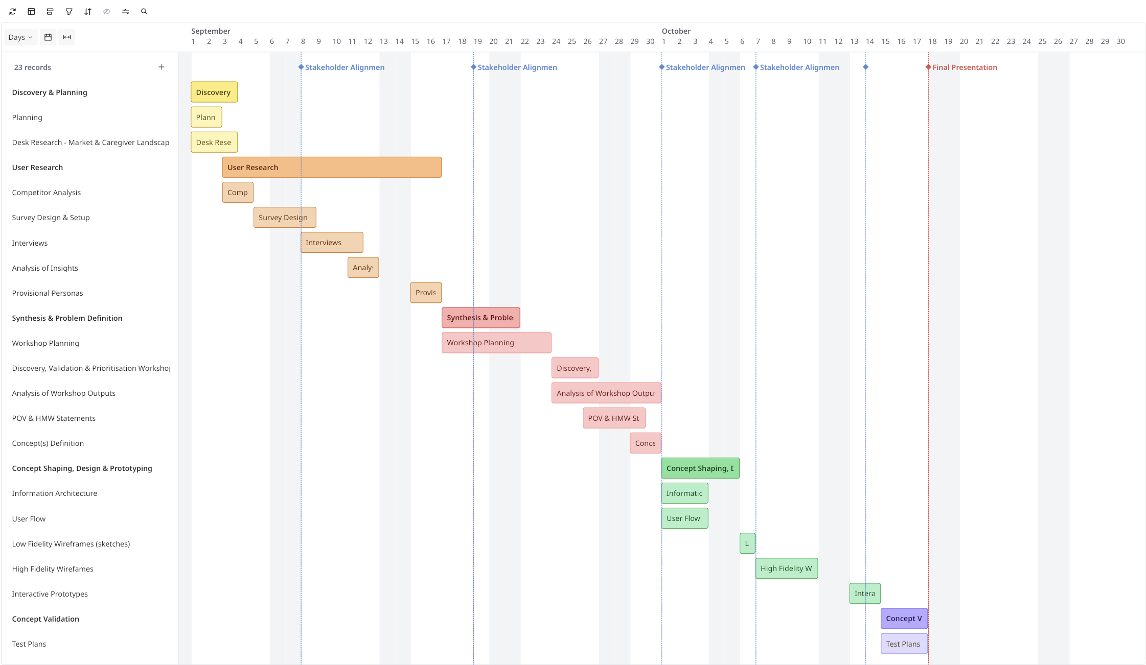 The roadmap aligned research, prototyping and testing milestones, and provided a shared timeline for the R&D and business teams at Pfizer to progress the four concepts from strategy to validated initiatives.